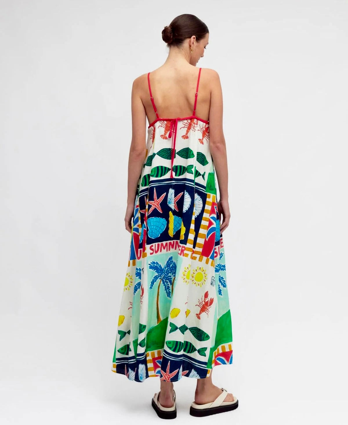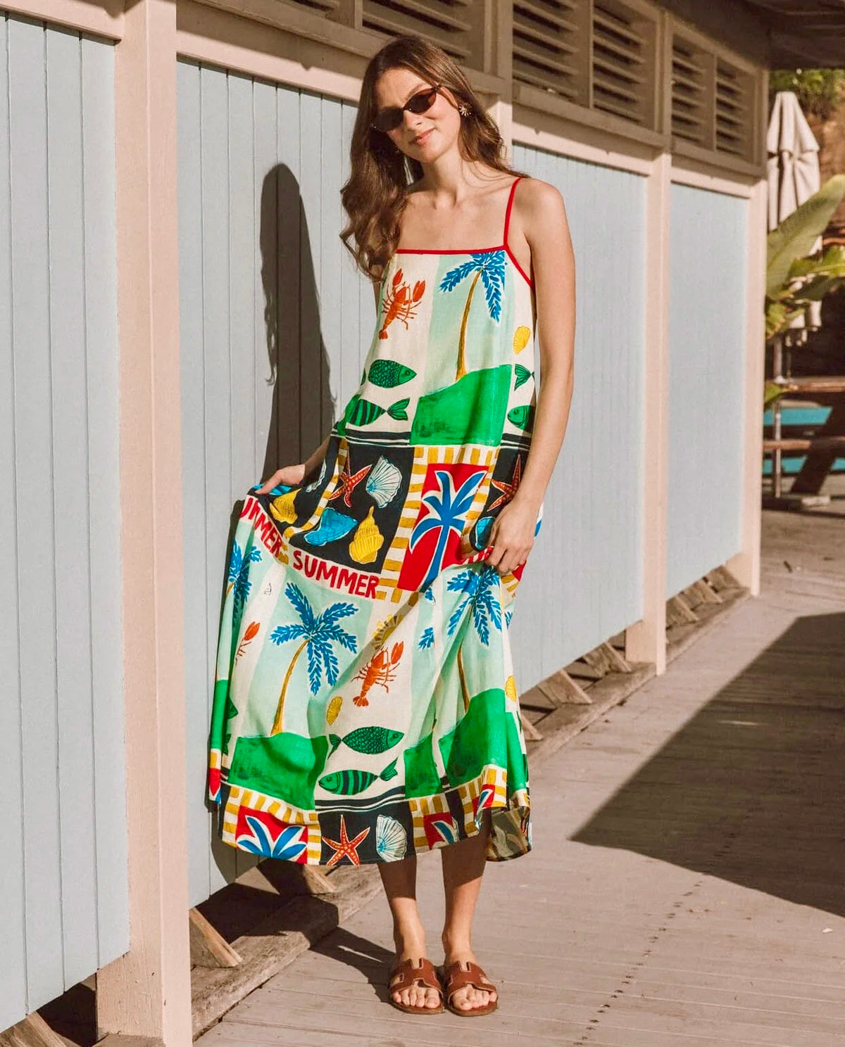 Turn the holiday mode on the second you slip into this one. This breezy maxi dress is all sunshine, sea breeze and “meet me by the bar” energy – with that incredible hand-drawn style print doing all the talking.
