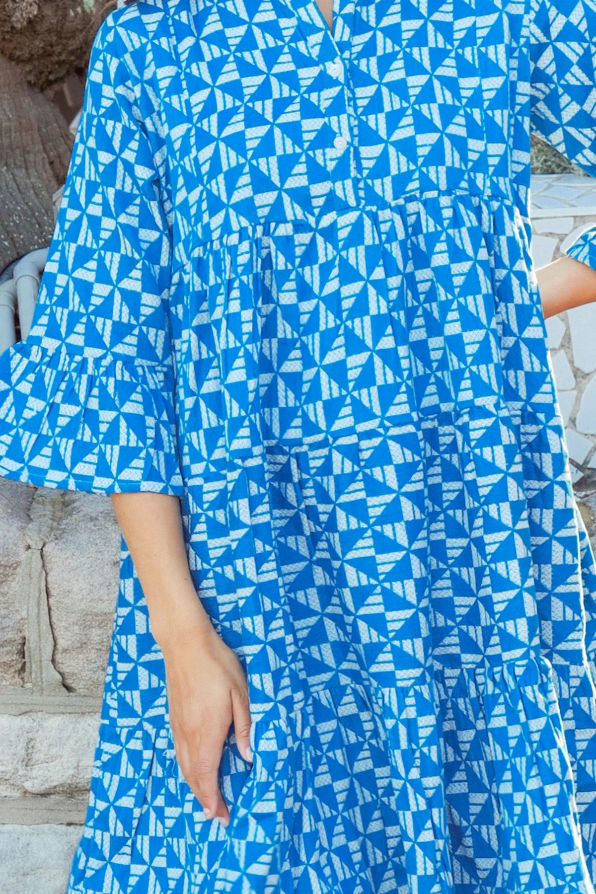 It's the perfect dress for any day or night. Stunning blue hue geo print. Accessorise with fun sunnies and a broadbrim hat for a day out, or elevate your look with statement jewellery and a handbag for the evening.