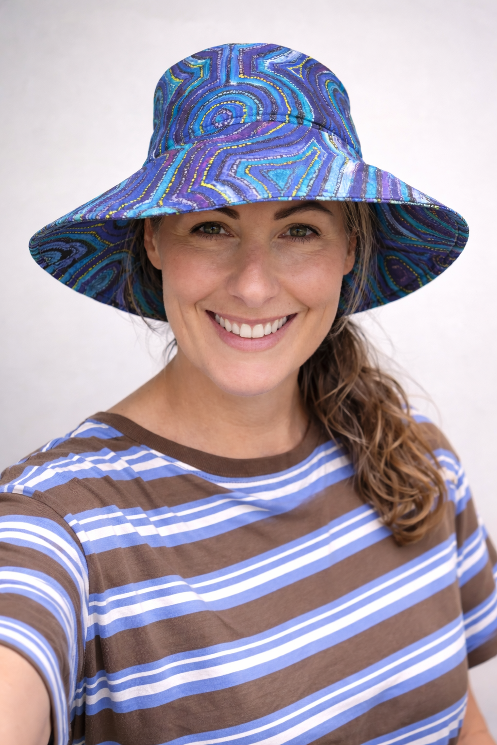 Featuring a striking Emu Dreaming design in rich blues and layered concentric patterns, this hat blends cultural storytelling with everyday wearability. The generous broad brim offers excellent sun protection, while the lightweight cotton construction keeps it comfortable for all-day wear.
