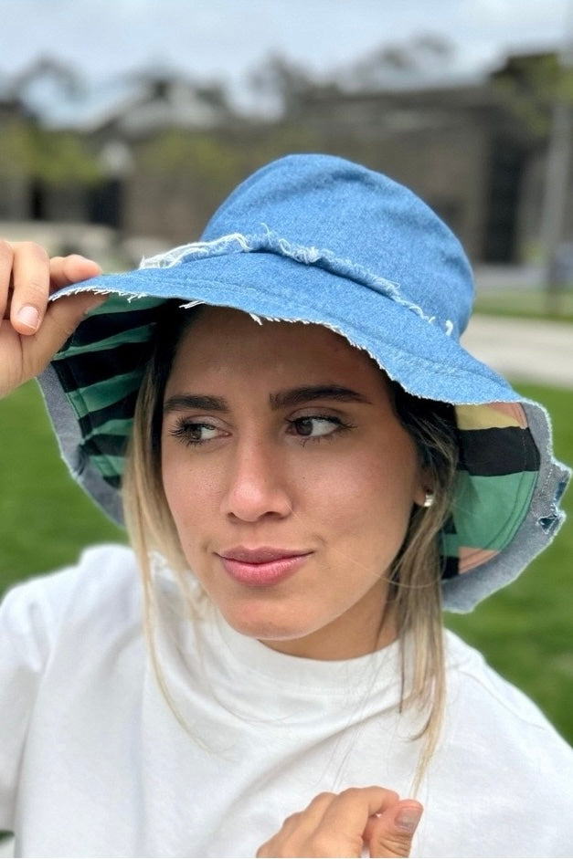 The only thing better than a new hat is one that is upcycled. Incredible blend of soft denim giving off that distressed look, inner lining is iconic Mireia Ruiz print - so why not wear it reversible. Designed and handmade by ownsit! in Melbourne. Protecting your face from the sun has never looked so fun and fabulous.