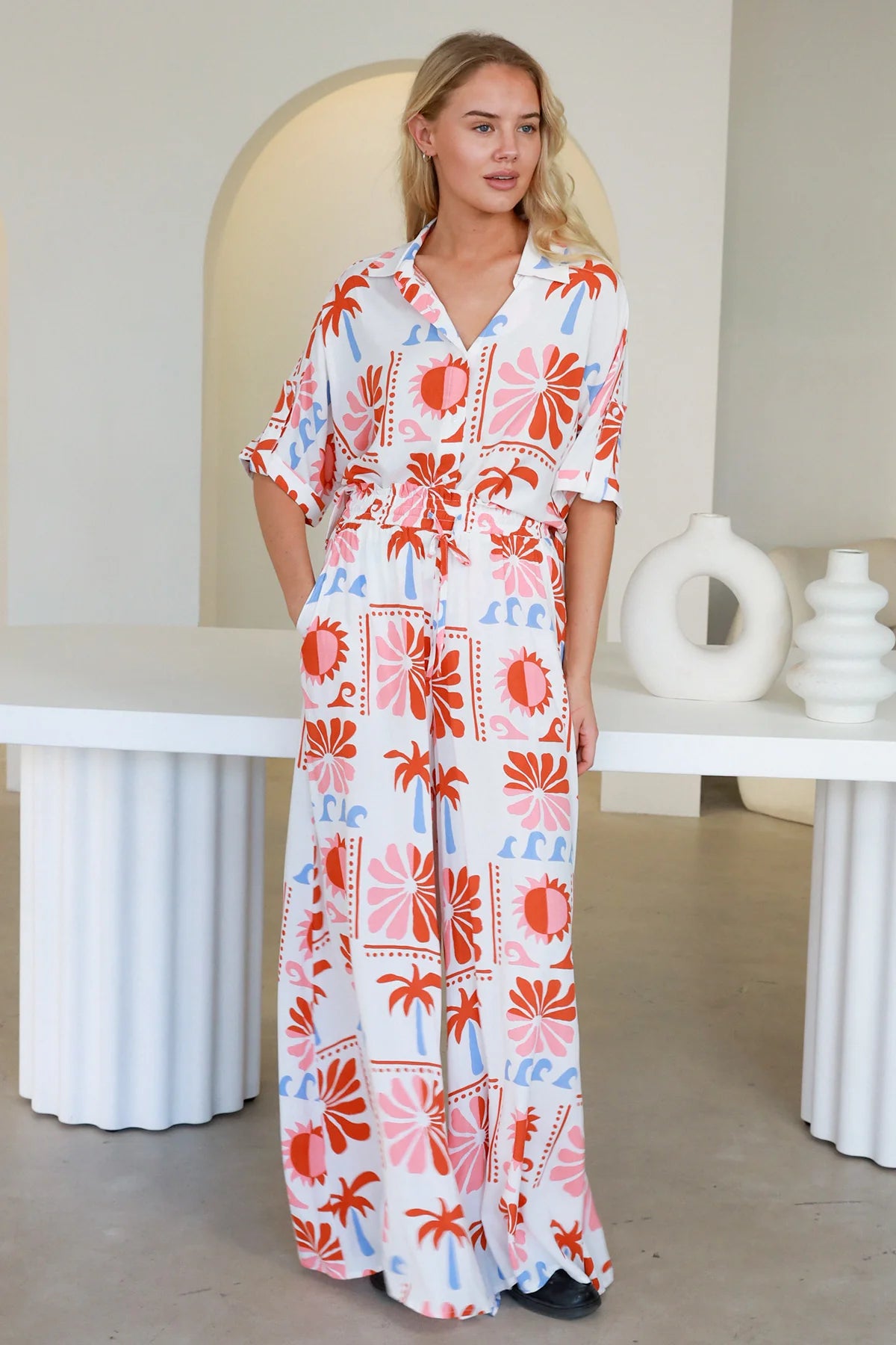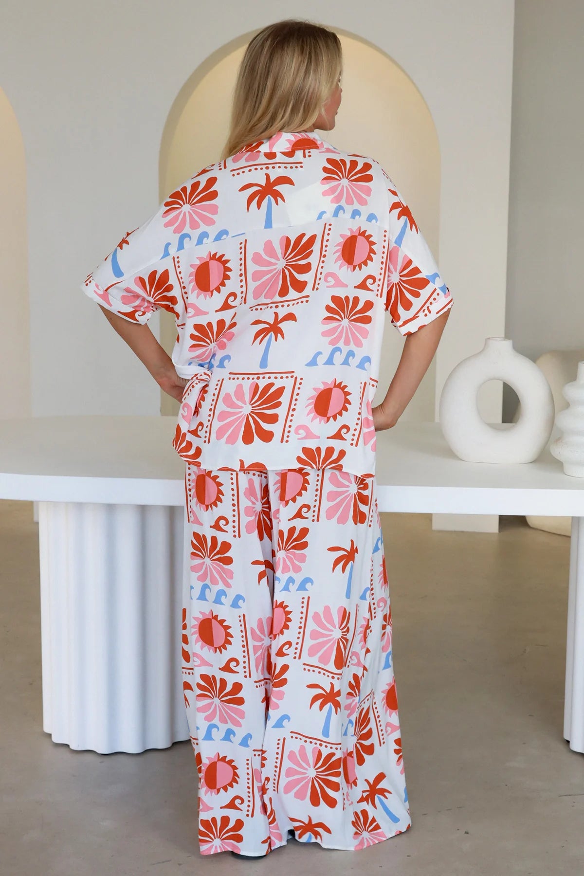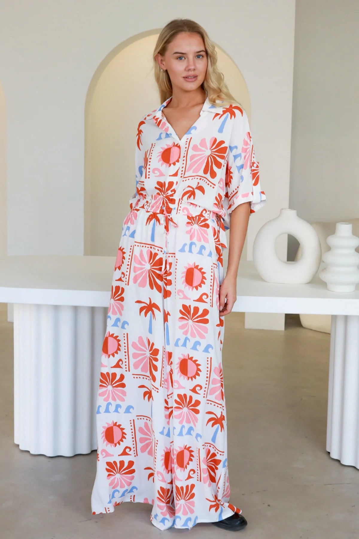 The bold geometric print in coral red, blush pink, and soft blue pops against a crisp white base, bringing playful vacation energy to your everyday wardrobe. Pair them with the matching shirt for a chic co-ord look, or style with a simple tank or tee for relaxed summer vibes.