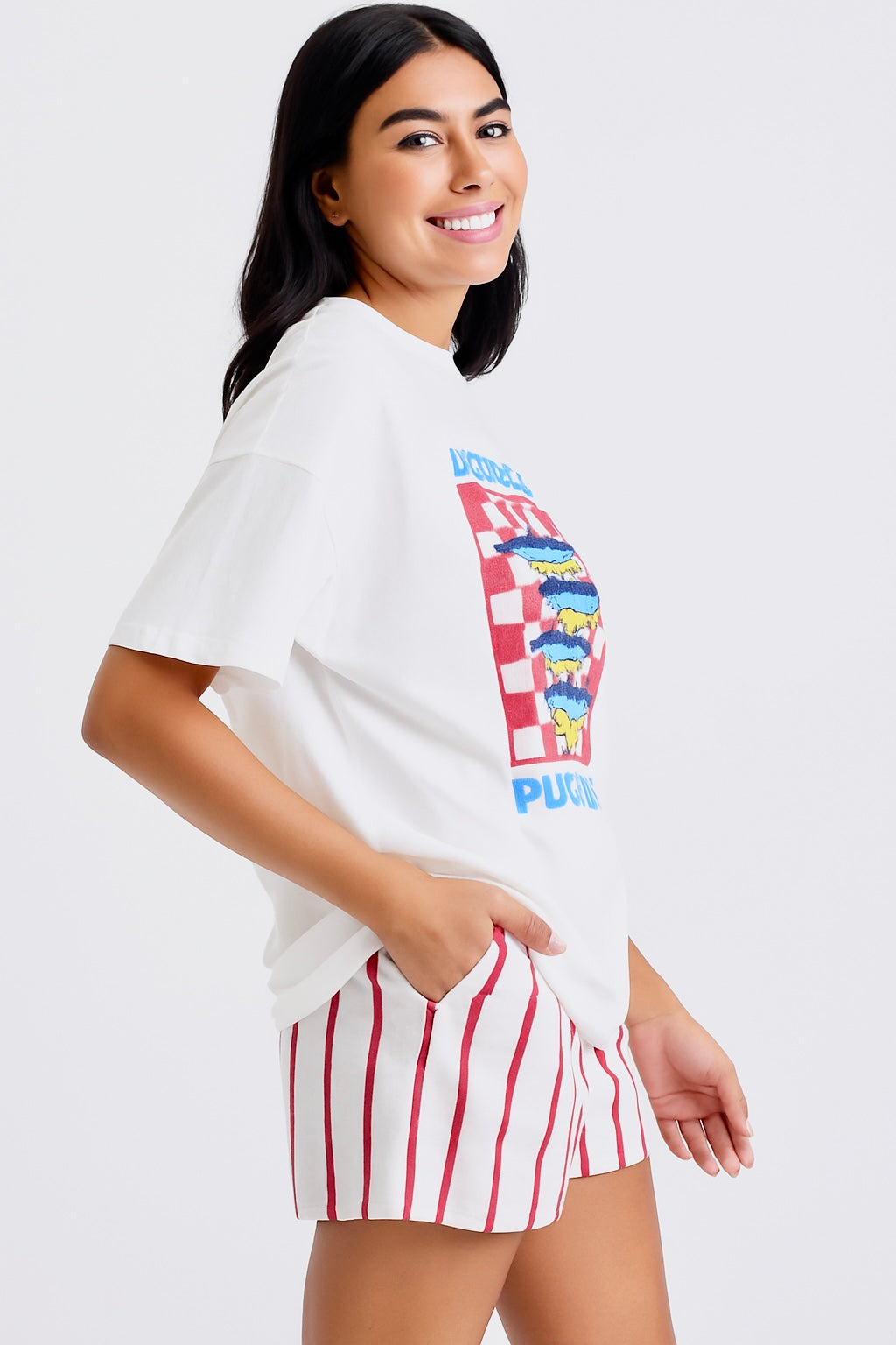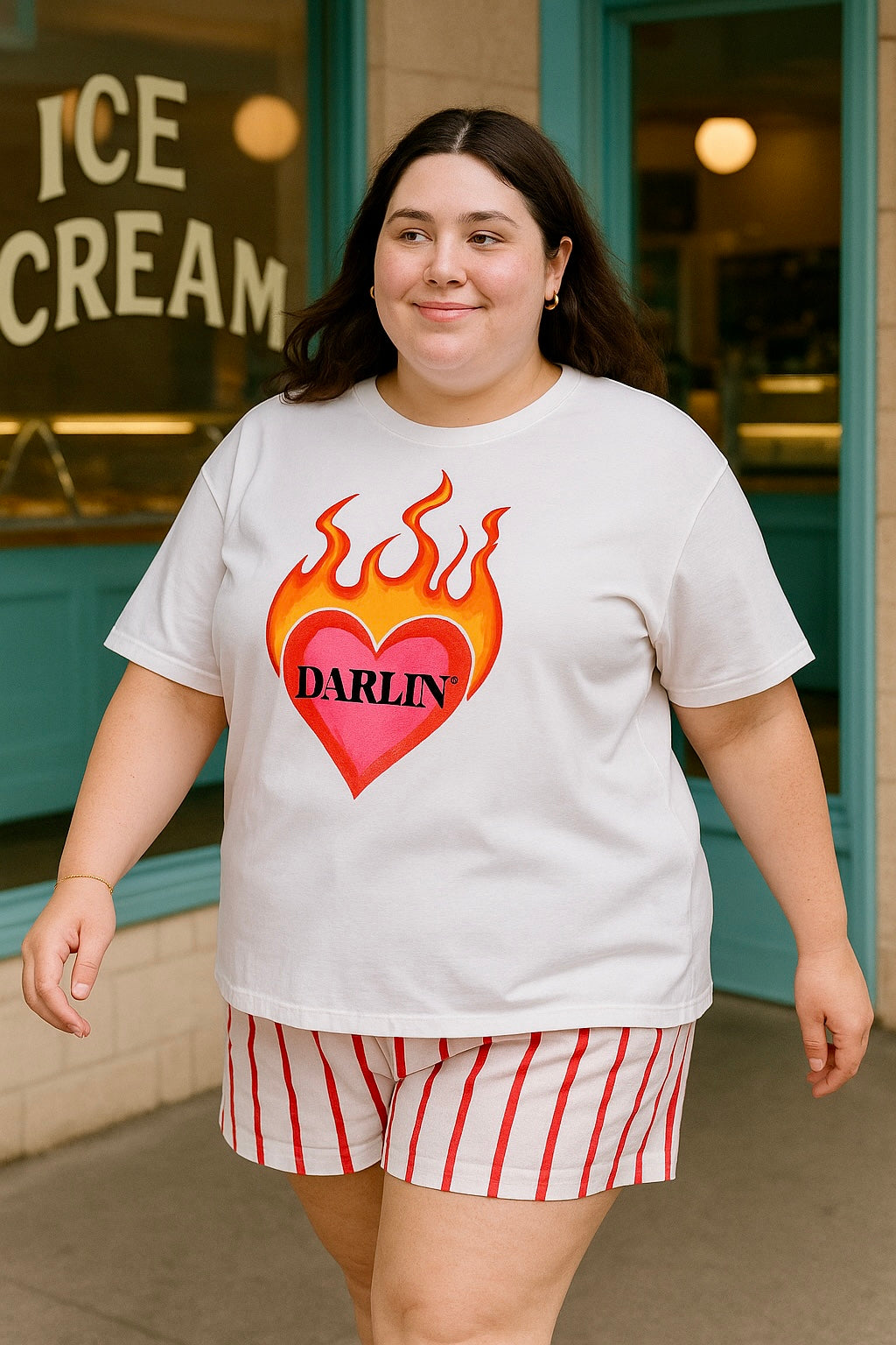 Model Brunette (Darlin tee) size 16 wears XL, 172cm height. Model brunette size 8 wears XS, 175cm height.