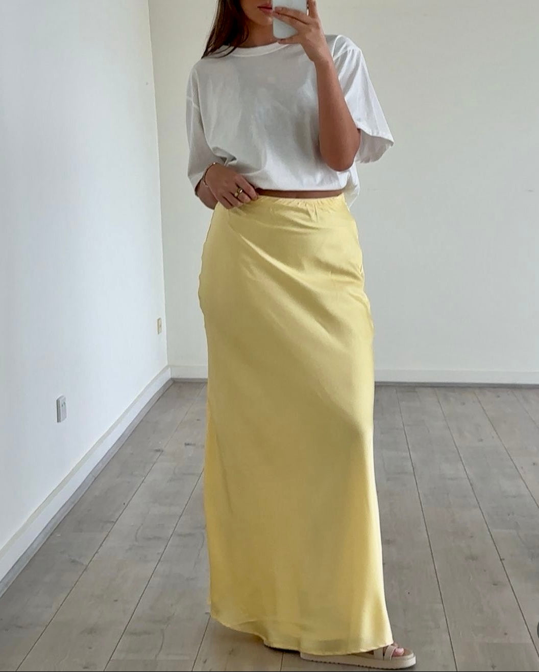 Slip skirts are here to stay - these slinky maxi skirts are gorge for dressing up or down. Absolutely beautiful to touch and the most elegant of colour. Dress with an oversized tee and sneakers for weekend wear or your fitted top and sandals for day night.