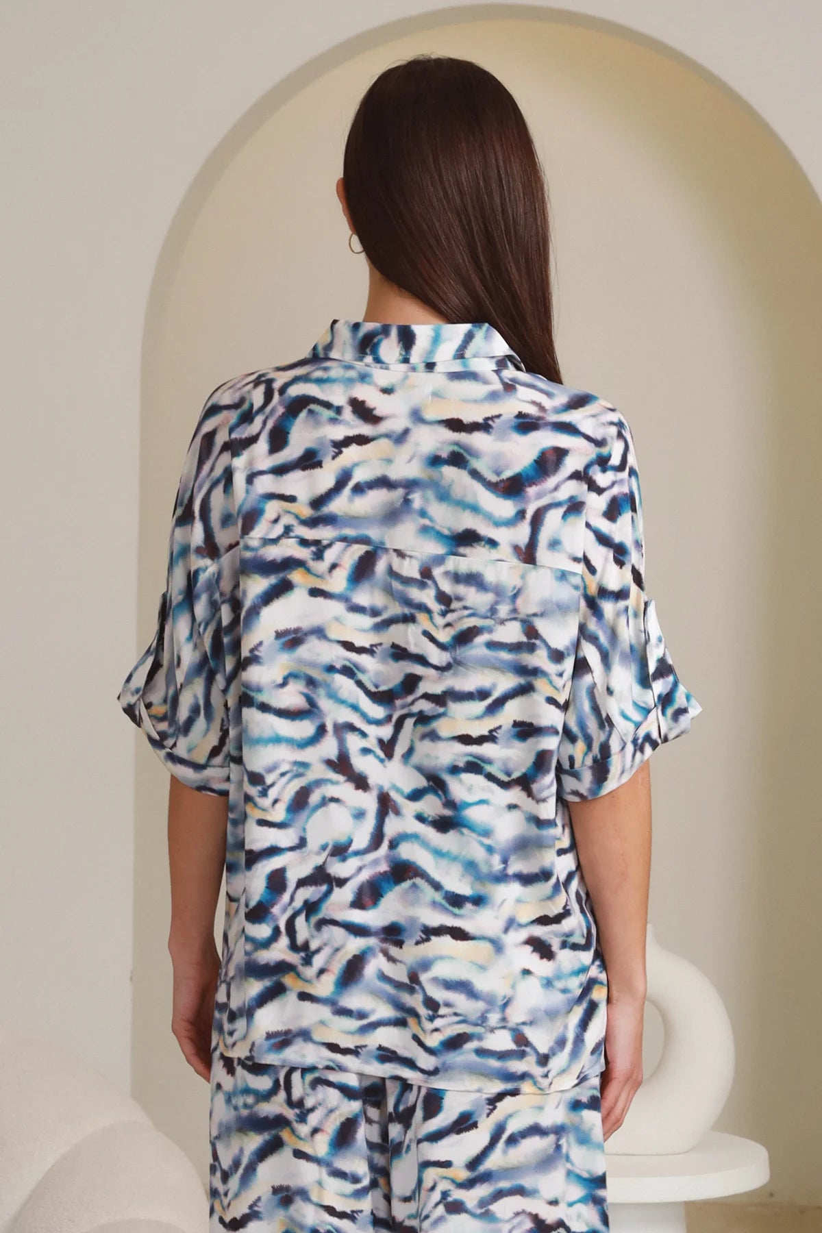A relaxed and contemporary shirt that blends comfort with bold design. The abstract watercolor-inspired print in shades of blue, black, and ivory adds an artistic edge to a classic silhouette. Featuring a collared neckline, button-down front, and rolled short sleeves, this piece is versatile for both casual wear and elevated styling.
