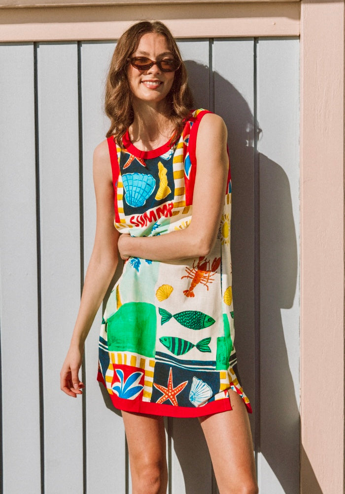 Meet the dress that feels like a holiday. The Laguna Mini Dress is an easy, feel-good style designed for warm days and carefree plans. Featuring a high round neckline, sleeveless silhouette, and a playful summer print, this mini is all about effortless wear with personality. Finished with a back button closure and practical side pockets, it’s your go-to for weekends, beach strolls, and casual catch-ups.